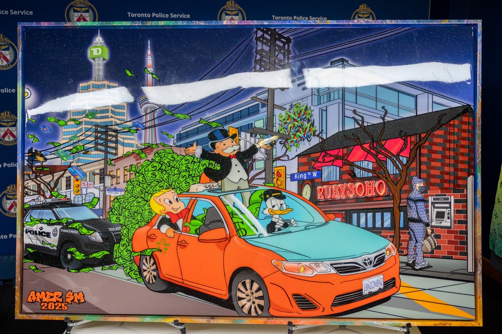 Imagine our delight when the crime ring was apprehended last year, and this remarkable painting was seized during the investigation. This custom commission illustrates the crime to a tee. I guess we’re Richie Rich in this scenario…