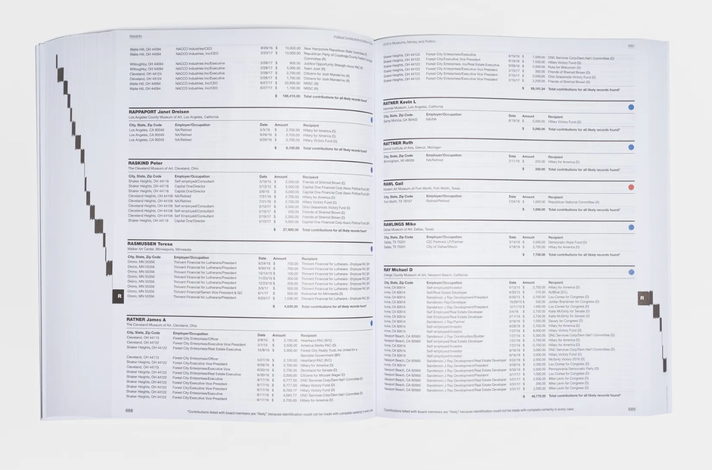 Andrea Fraser is one of my favourite artists, particularly for the way she critiques art institutions from within. Her piece 2016 in Museums, Money, and Politics documents the reported political contributions made by trustees of more than 125 art museums in the 2016 election cycle.