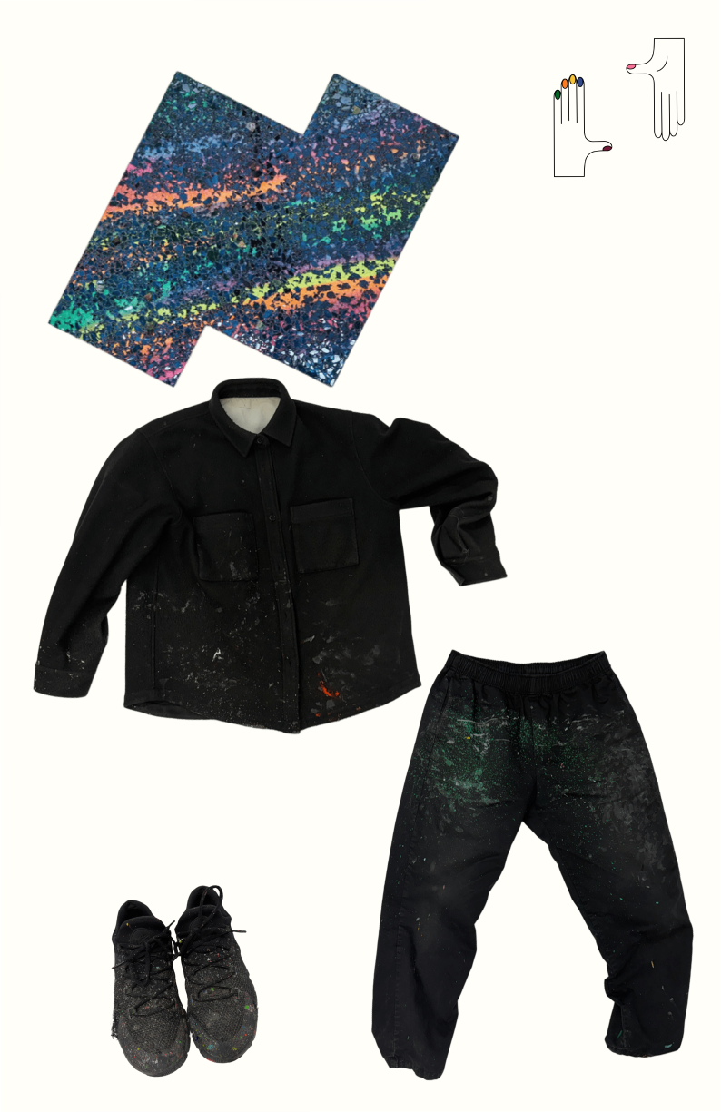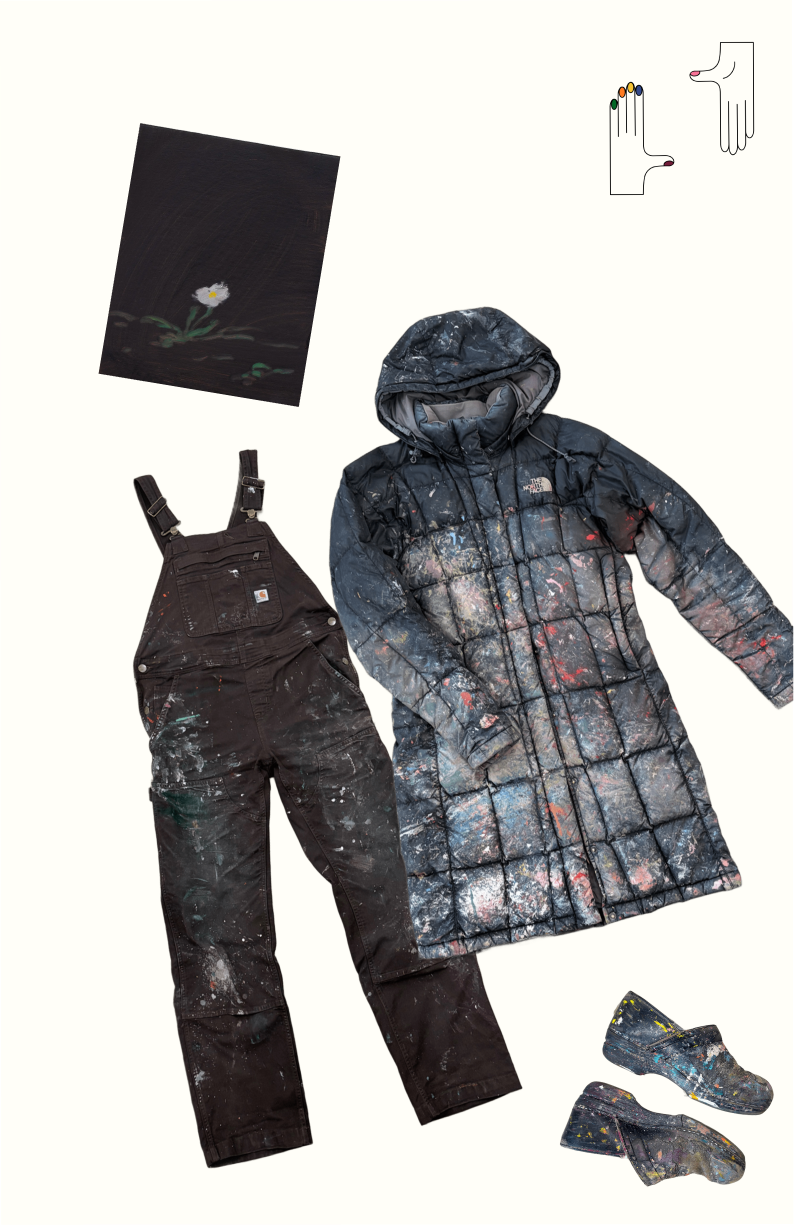 Below are real articles of clothing from real artists, revealing what they wear to the studio. The accumulation of marks from their studio practice creates an aura that can’t be replicated in the above facsimiles. I was struck by how, when viewed side by side, their clothing and paintings share a certain aesthetic cohesion, revealing the essence of their work and the power of clothing to communicate.